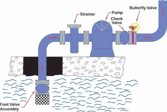 โดยฟุตวาล์วนี้จะทำหน้าที่ในการเก็บกักของเหลว หรือน้ำเข้าไปในท่อขาดูดของปั๊มได้ คือของเหลวไหลเข้ามาแต่ฟุตวาล์วป้องกันไม่ให้ไหลกลับออกมา ซึ่งเมื่อดูดเข้ามาเรื่อยๆก็สามารถทำให้ปั้มเก็บกักของเหลวได้แล้วส่งออกไปที่ขาออกได้นั้นเอง โดยก่อนดูดขึ้นมาเราจะต้องทำการเติมน้ำเข้าไปให้เต็มในท่อขาดูดก่อนนะครับที่เราคุ้นชินกับคำว่า “ล่อน้ำ หรือ Pump-Priming นั่นเอง” ครับผม