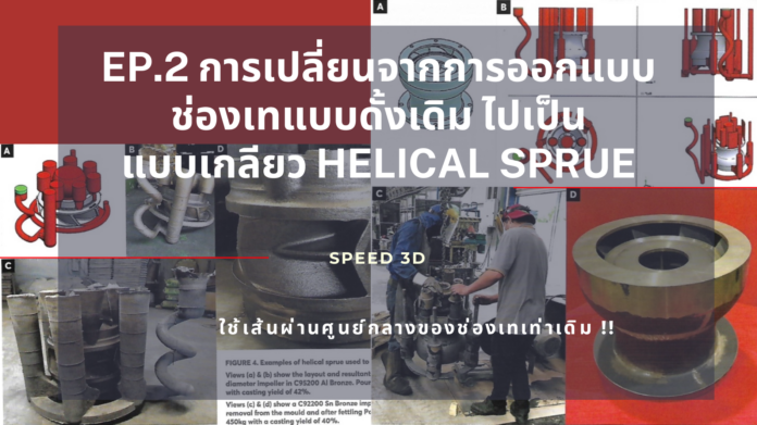 รูปที่ 4: ตัวอย่างการใช้ ช่องเทแบบเกลียว (Helical sprue) ในการผลิต ใบกวน (Impeller)