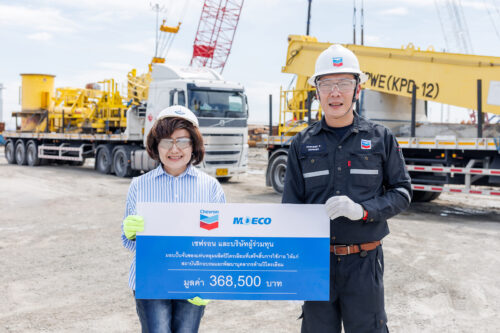 เมื่อเร็วๆ นี้ บริษัท เชฟรอน ประเทศไทยสำรวจและผลิต จำกัด และบริษัท มิตซุย เอ็นเนอร์จี ดีเวลลอปเมนท์ คัมปะนี ลิมิเต็ด นำโดย นายปัณวรรธน์ นิลกิจศรานนท์ (ขวา) รองประธานกรรมการบริหาร ฝ่ายวิศวกรรมโครงสร้าง บริษัท เชฟรอนประเทศไทยสำรวจและผลิต จำกัด เป็นตัวแทน ส่งมอบปั้นจั่น (เครน)ของแท่นหลุมผลิตปิโตรเลียมที่ผ่านการใช้งานแล้วแต่ยังมีสภาพดี มูลค่า 368,500 บาท ให้แก่ สถาบันฝึกอบรมและพัฒนาบุคลากรด้านปิโตรเลียม (TPTI)