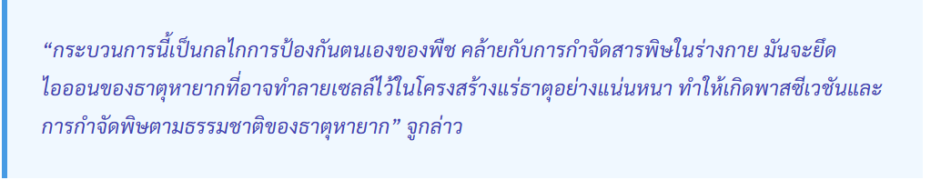 การวิเคราะห์ของทีมวิจัยแสดงให้เห็นว่าใบย่อย ระบบราก และก้านใบมีแร่ธาตุหายากปนอยู่ แร่ธาตุเหล่านี้จะตกผลึกภายในเนื้อเยื่อนอกเซลล์ภายใต้สภาวะแวดล้อมสำหรับพืช เพื่อป้องกันไม่ให้ธาตุที่ไม่ใช่สารอาหารเข้าสู่เซลล์และเพื่อกำจัดสารพิษ