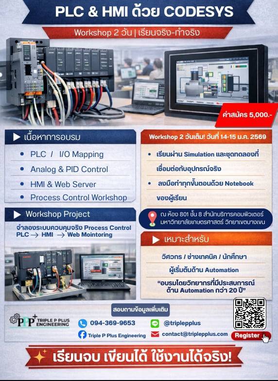 ในยุคที่ระบบอัตโนมัติคือหัวใจของภาคอุตสาหกรรม การเข้าใจและสามารถพัฒนา PLC และ HMI ได้ด้วยตนเอง ไม่ใช่แค่ทักษะเสริม แต่คือความได้เปรียบในการทำงานจริง Workshop PLC & HMI ด้วย CODESYS ถูกออกแบบมาเพื่อผู้ที่ต้องการ “เรียนรู้จากของจริง ทำงานกับระบบจริง” ตั้งแต่พื้นฐานไปจนถึงการนำไปใช้งานในระบบ Process Control อย่างครบวงจร
