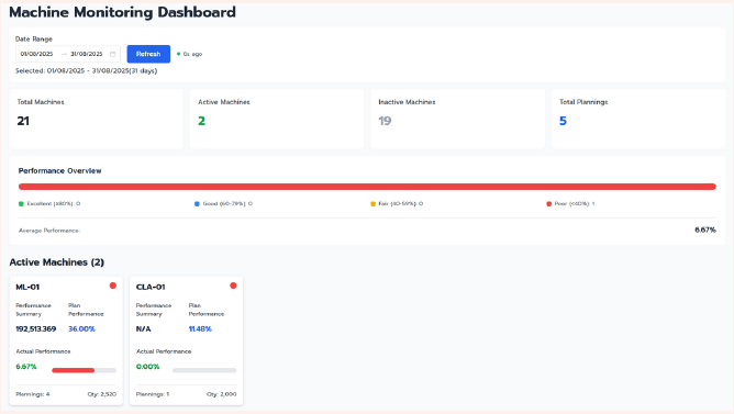 - ดึงข้อมูลจากเครื่องจักรและหน้างานโดยตรง เช่น จำนวนการผลิต เวลาเดินเครื่อง และเวลาหยุดเครื่อง