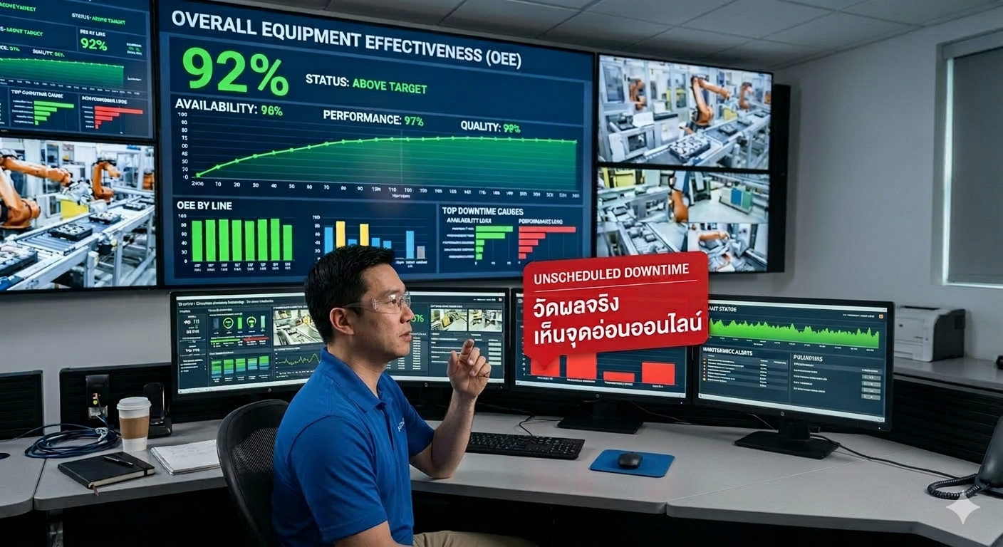 หลายโรงงานตั้งเป้า OEE 85% แต่ทำได้จริงเพียง 60–70% เพราะการเก็บข้อมูลแบบ Manual ทำให้วิเคราะห์ไม่ชัดว่าเสียที่ Availability, Performance หรือ Quality OEE เป็นเครื่องมือวิเคราะห์การสูญเสียเชิงวิศวกรรม หากข้อมูลไม่ Real-Time ค่าที่ได้ย่อมคลาดเคลื่อน