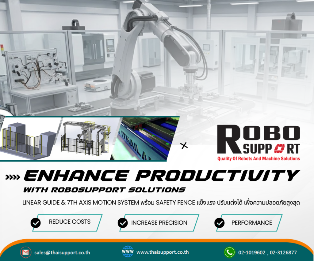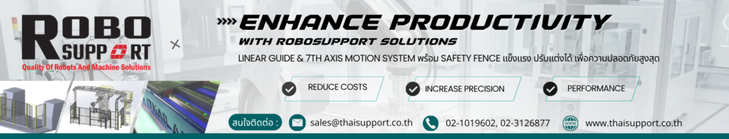 ในอุตสาหกรรมยุค Automation การใช้หุ่นยนต์ (Robot) กลายเป็นหัวใจสำคัญของการเพิ่ม Productivity แต่หุ่นยนต์ 6 แกนแบบทั่วไปยังมีข้อจำกัดเรื่อง “ระยะการทำงาน” นี่คือเหตุผลที่ ROBOsupport Track Motion หรือ 7th Axis Robot ถูกพัฒนาขึ้นมา เพื่อปลดล็อกข้อจำกัดนี้ และยกระดับการทำงานของหุ่นยนต์ในโรงงานอุตสาหกรรม