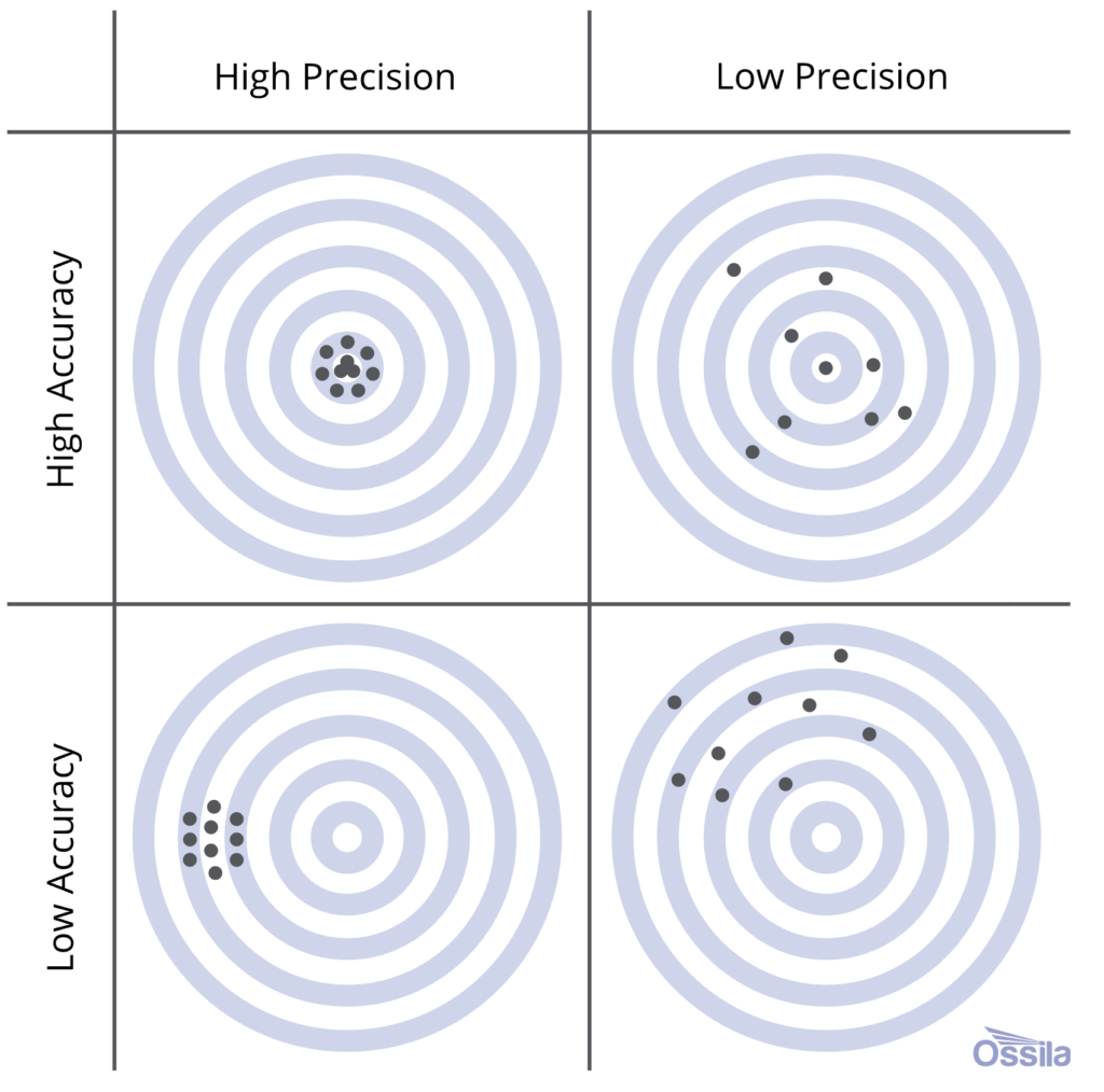 ระบบการวัดที่ดีต้องมีทั้งสองอย่าง หากวัดซ้ำได้ค่าใกล้กันแต่เบี่ยงจากค่าจริง แสดงว่ามี Precision สูงแต่ Accuracy ต่ำ ซึ่งอาจเกิดจากการสอบเทียบที่ไม่ถูกต้อง