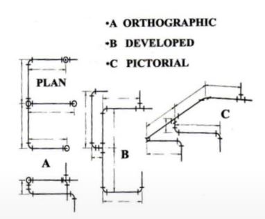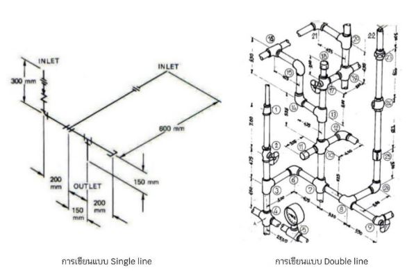 เป็นการเขียนแบบท่อโดยใช้เส้นเดียว โดยกำหนดเป็นขนาดเส้นผ่านศูนย์กลางท่อ และใช้สัญลักษณ์ เพื่อทำให้เขียนได้ง่าย และรวดเร็ว มีทั้ง 2 มิติ และ 3 มิติ ครับ