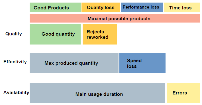 โดยการวัดประสิทธิผลโดยรวมของเครื่องจักร หรือการใช้ OEE เป็นวิธีการที่ดีวิธีหนึ่งที่นอกจากทำให้รู้ประสิทธิผลของเครื่องจักรแล้วยังรู้ถึงสาเหตุของความสูญเสียที่เกิดขึ้นทั้งในภาพใหญ่ คือ