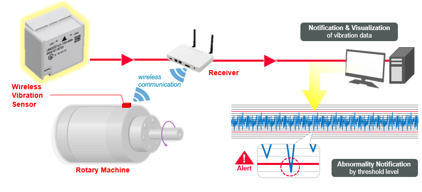 โดยการติด Vibration sensor และใช้การส่งข้อมูลแบบไร้สาย (Wireless solution) ในการส่งข้อมูลขึ้น Gateway และมาแสดงผลใน Local Panel หรือ Monitor ต่างๆ ทั้งยังสามารถเก็บข้อมูลคุณภาพของเครื่องจักรไว้เพื่อวิเคราะห์ปัญหาต่อไปได้ในอนาคตอีกด้วยนะครับ