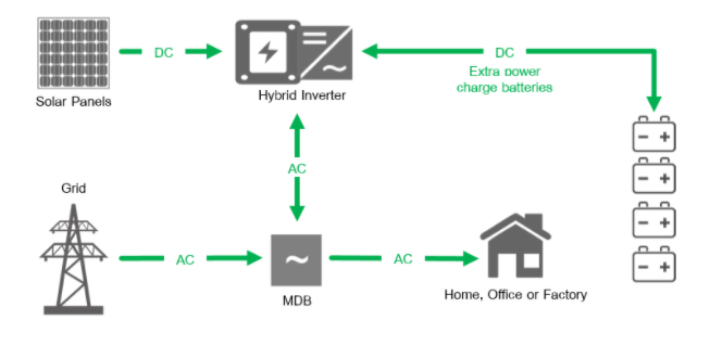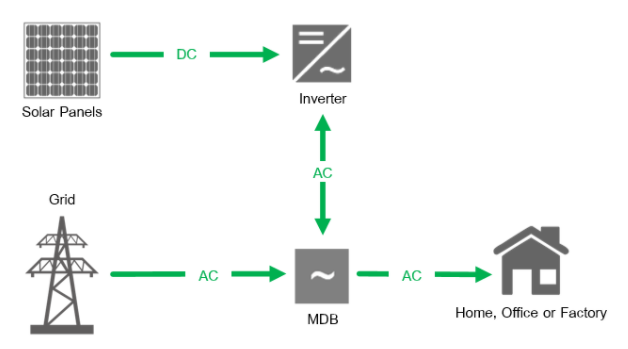 แต่ที่ Inverter และ Switch boarder นั้นจะมีการต่อกับ Grid ของการไฟฟ้า นั้นหมายความว่าพลังงานที่โซล่าเซลล์ผลิตได้เพียงพอกับอุปกรณ์ไฟฟ้าในบ้านหรือโรงงานต้องการ ก็จะไม่จำเป็นต้องใช้ไฟฟ้าจาก Grid ของการไฟฟ้า ในทางกลับกัน ถ้าไม่เพียงพอระบบจะทำการดึงไฟฟ้าจากการไฟฟ้ามาช่วยจ่ายให้ได้โดยอัตโนมัติ