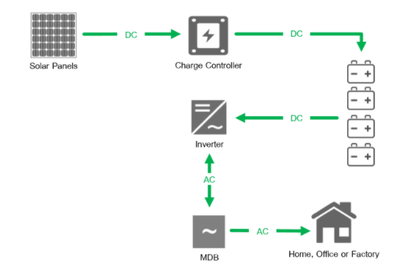 ระบบโซล่าเซลล์ที่ออกแบบมาเป็นแบบ Off grid นั้นจะคล้ายๆ กับ On grid แต่จะแตกต่างตรงที่จะไม่มีการเชื่อมต่อกับ Grid ของการไฟฟ้า และมีการติดตั้ง Battery เข้าไปเพื่อเป็นพลังงานสำรองของโซล่าเซลล์ นั่นก็หมายความว่าอุปกรณ์ไฟฟ้าในบ้านและโรงงานนั้นจะรับไฟฟ้าผ่านโซล่าเซลล์อย่างเดียว โดยจะไม่มีการรับไฟฟ้าจากทางการไฟฟ้าอย่าง PEA หรือ MEA