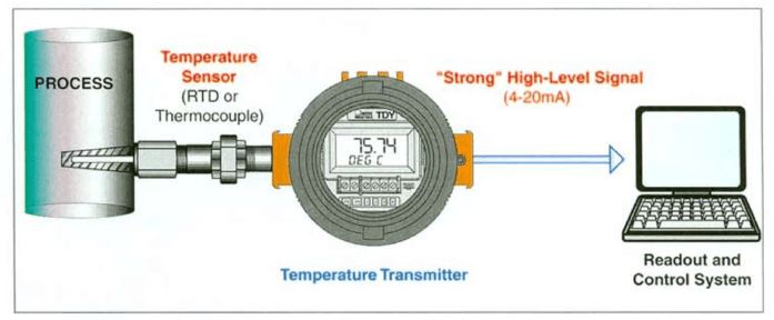 ส่วนประกอบหลักอย่างที่ 2 คือ Temperature Transmitter ซึ่ง Transmitter ในปัจจุบัน จะใช้เป็นตัวแปลงสัญญาณที่ตัว Sensor วัดออกมาและส่งค่าไปยังศูนย์ควบคุม โดยที่ค่า Output จาก Transmitter สามารถเลือกได้ทั้งแบบ 4-20 mA และ Foundation Fieldbus ขึ้นอยู่กับระบบควบคุบของเราว่าต้องการใช้แบบไหน