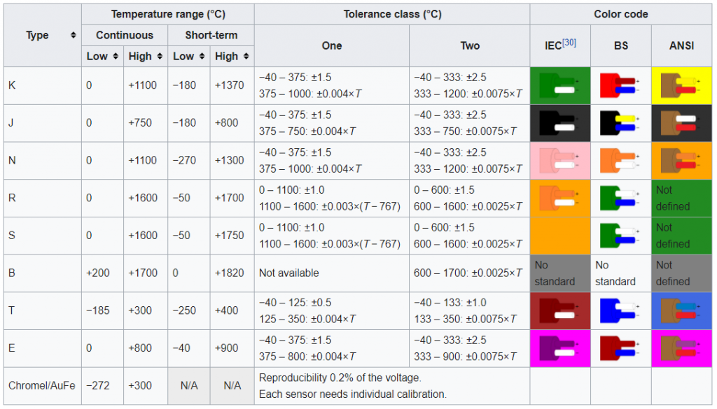 โดยชนิดของ Thermocouple แต่ละชนิดจะทำจากวัสดุที่ต่างกัน และแต่ละชนิดก็จะมีช่วงใช้งาน (Range) ที่แตกต่างกันตามตารางด้านล่างได้เลยนะครับ