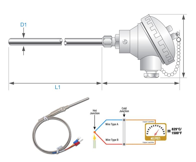 Thermocouple โดย Thermocouple จะประกอบด้วยโลหะสองชนิดที่แตกต่างกันนำมาเชื่อมต่อกันที่ปลาย เมื่อเกิดอุณหภูมิที่แตกต่างกันระหว่างจุดเชื่อมทั้งสอง จะทำให้เกิดแรงดันทางไฟฟ้าขนาดเล็กขึ้น โครงสร้างของ Thermocouple จะแบ่งตามลักษณะการเชื่อมต่อกันที่ปลายจุดวัด โดยมี 3 ลักษณะคือ