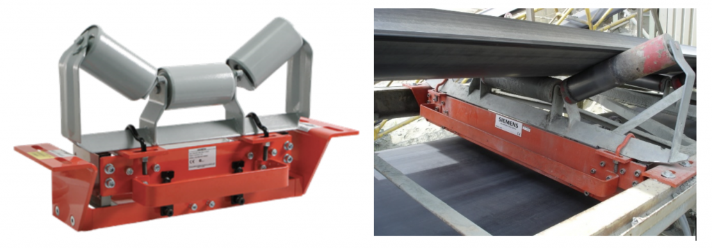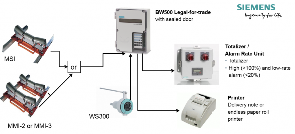 (1) Belt scales เป็นอุปกรณ์ที่อยู่ด้านล่างของสายพาน ซึ่งจะมีทั้งแบบลูกกลิ้งเดี่ยว (Single idles : MSI) และแบบหลายลูกกลิ้ง (Multi-idler : MMI2/MMI3) ที่มีการทำงานร่วมกับ Load cell & Speed sensor โดย Belt scales สามารถวัดและมีค่าความแม่นยำอยู่ที่ +/- 0.5% สำหรับ Single idler และ +/- 0.125 – 0.25% (ขึ้นอยู่กับรุ่นของ Belt scales) สำหรับ Multi-idler ระหว่างการวัด 20 – 100 % ของค่าความสามารถในการลำเลียงเต็มประสิทธิภาพ ซึ่ง Belt scales ในการใช้งานบางประเภทนั้นจะต้องใช้งานกับเหมือง ที่จะมีความอันตรายทางด้านการระเบิด ดังนั้น Belt scales ที่ใช้งานต้องถูกออกแบบให้สามารถใช้งานใน Hazardous area โดยได้รับ Certified จากทาง CSA และ ATEX