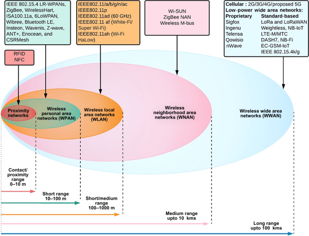 สำหรับการส่งสัญญาณด้วย Wireless Wide Area Network หรือ WWAN สามารถมีการส่งระยะทางได้ไกลถึง 100 กิโลเมตร โดยจะหมายถึงกลุ่มสื่อสารแบบ Cellular และมีกลุ่มสื่อสารใหม่เข้ามาเพิ่มคือ Low Power Wide Area (LPWA) เพื่อรองรับการสื่อสารความเร็วต่ำ แต่ว่ามีอายุใช้งานแบตเตอร์รี่ที่สูง (เพราะกินพลังงานที่ต่ำ) และสามารถเชื่อมต่ออุปกรณ์ระยะที่ไกลได้ โดยแบ่งออกเป็นสองกลุ่มย่อยคือ