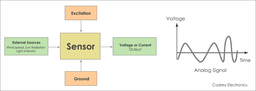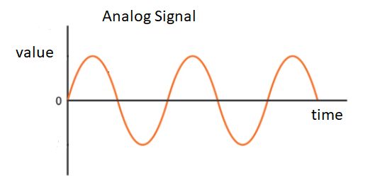 สัญญาณ Analog คือสัญญาณในรูปแบบของคลื่น Sine Wave ซึ่งมีความถี่และความเข้มของสัญญาณต่างกัน มีการเปลี่ยนแปลงขนาดของสัญญาณแบบรูปคลื่น (ดังภาพ) โดยคุณสมบัติเด่นของสัญญาณอนาล็อก (Analog Signal) คือ สามารถส่งสัญญาณได้ในระยะไกล สามารถพบเห็นการใช้สัญญาณอนาล็อก (Analog Signal) ทั่วไปในงานภาคอุตสาหกรรมร่วมกับอุปกรณ์ PLC หรือดังเข้าคอมพิวเตอร์เพื่อ Monitoring ตัวแปรต่างๆ โดยประเภทสัญญาณอนาล็อก (Analog Signal) มี 4-20 mA, 0-20mA, 0-10VDC เป็นต้น