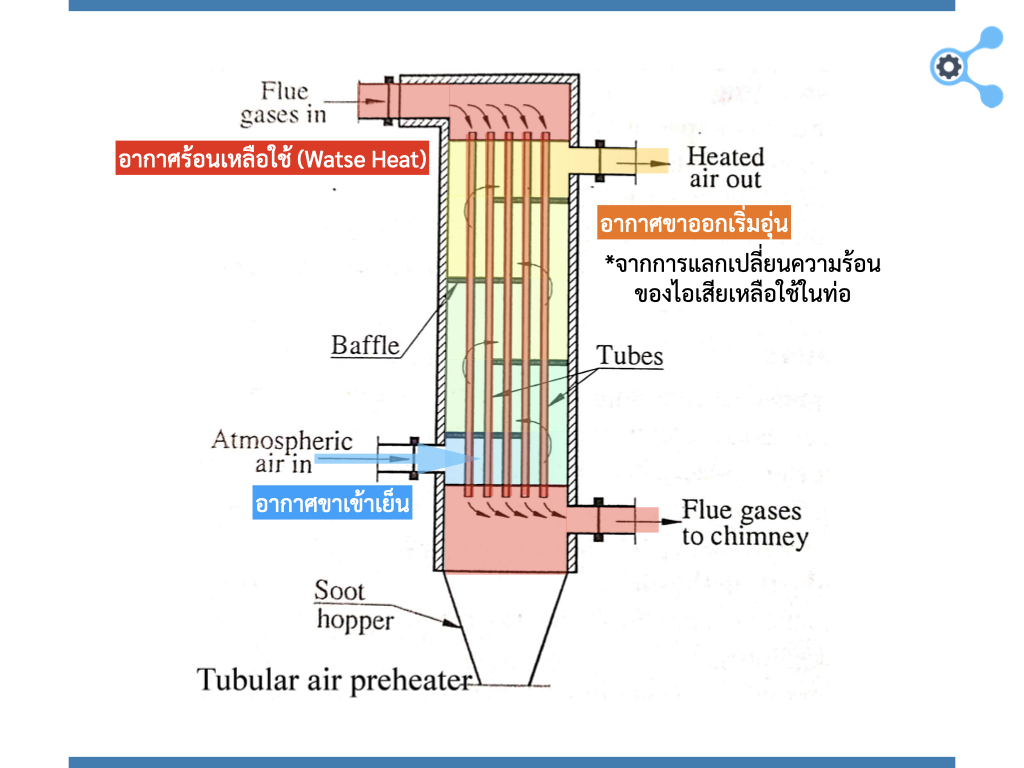 อุปกรณ์ Air Preheater เป็น “อุปกรณ์ที่นำความร้อนทิ้งกลับมาใช้ใหม่” โดยใช้ความร้อนที่จริงๆจะต้องปลอยทิ้ง เช่น ระบบในระบบก๊าซท่อไอเสียในเตาเผา หรือหม้อไอน้ำที่จะต้องปล่อยทิ้งแบบฟรีๆ เอาวนกลับมาอุ่น (Preheat) อีกรอบที่ขาเข้าของช่องทางเข้าของอากาศนั่นเองครับ ซึ่งส่งผลทำให้อากาศสำหรับเผาไหม้มีอุณหภูมิสูงขึ้น จะทำให้เชื้อเพลิงติดไฟง่ายขึ้นและประสิทธิภาพการเผาไหม้สูงขึ้นมากเลยครับ